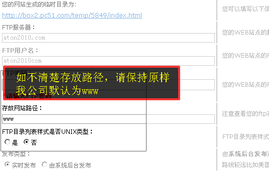 如果是独立购买的建站宝盒,还需要输入ftp服务器中的网站目录等信息,如不清楚请保持原样,或者咨询主机提供商业。